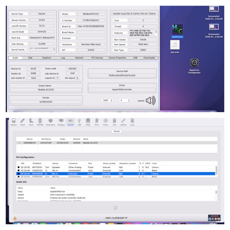 sera gente, mi hanno regalato un asus vivobook A551L. sto installando OSX tanto per sperimentare. da catalina a sequoia si installa bene e senza problemi e funziona bene, ma su tutti i sistemi manca l'audio. ho provato a lavorare sul config.plist nella sezione PCIList anche con hpet patchato, nulla. provato metodo alcid= con con tutti i layout disponibili per ALC 233. quasi nulla. con i layout altri si sente chimera, ma a sistema avviato funziona solo l'audio in cuffia. il mic. lo vede ma non funziona. (3, 4, 5, 13, 21, 27, 28, 29, 32, 33) boh, datemi qualche idea. i5 di quarta gen HD 4400 atheros AR298X realtek ALC 233 grazie.