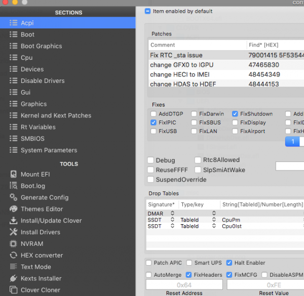 altro passettino compiuto... ora Nota 2 - estrarre e postare le ACPI: spesso viene fatta questa richiesta, ecco come fare: riavviare l'hack e fermarsi nella GUI di Clover, premere il tasto F4 e aspettare 30/40 secondi (a monitor non succede assolutamente niente) poi avviare regolarmente, montare la EFI, comprimere e uplodare la cartella origin che si trova nel percorso EFI --> CLOVER --> ACPI Nota 4 - Mappature delle USB: per eseguire tale operazione occorre che il sistema abbia tutte le USB attive con USBIjectall + Port Limit Patch (per i notebook solitamente basta USBInjectall) poi armati di pendrive USB 2 e 3 si avvia ioreg e una alla volta si infila ed espellono entrambe le pendrive in tutte le porte presenti, si prosegue con ioreg -> file -> save as si salva, si comprime e si posta nel proprio thread o in quello dedicato assieme alle ACPI estratte ed eventualmente la EFI senza all'interno la cartella APPLE o Microsoft che appesantiscono il tutto e non servono a niente.