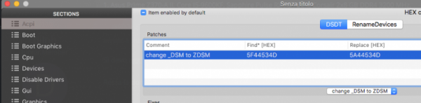 ti stai incasinando con cose supplementari in caso servano, devi fare solo questo che è già presente nella lista patch e flaggare su disable per tutte le altre poi devi inserire in EFI CLOVER ACPI patched SSDT kaby coffe lake SSDT-Kaby_CoffeLake.aml.zip ovviamente decompressa, aggiunger il nome con estensione in sorted order finito! quando fatto riavvia e posta ioreg, se hai dubbi, posta prima la EFI che controllo