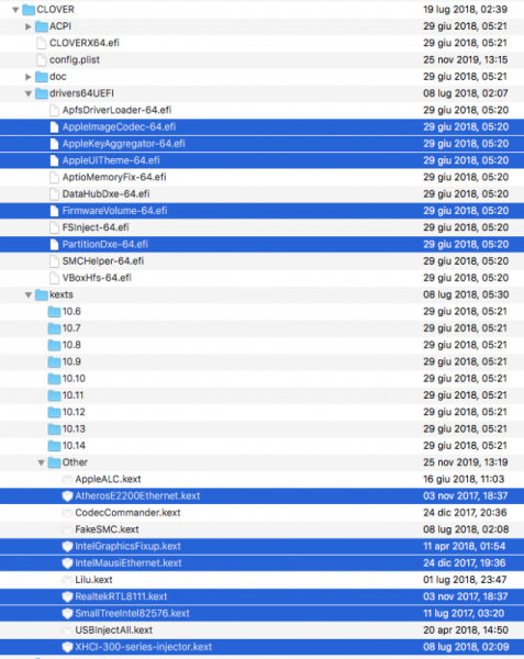 quelli evidenziati in drivers64UEFI non ti servono i kext evidenziati sono da: intelgraphicsfixup deprecato, sostituire con WEG i kext per la LAN, metti solo quelli per il modello che hai a bordo XHCI-300 non ti dovrebbe servire, ma lasciamo un punto interrogativo AppleALC e LILU sono da aggiornare alle recenti release.... li trovi in downloads o il sito acidanthera sulla home da noi dove poterli scaricare Clover è da aggiornare alla più recente release.... se usi l'installer, controlla poi il risultato dell'installazione 🤞