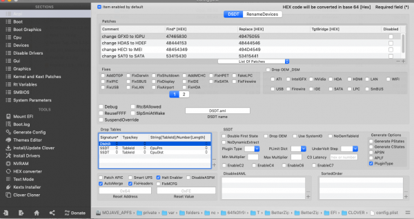 allora.. in ordine sparso: DSDT da dove arriva? non credo sei in grado di farlo tu, se lo fossi saresti anche capace di configurare tutto il resto quindi se è roba pescata in giro per il web da macchine anche identiche, meglio togliere per l'audio, i voodoo sono sicuramente una buona alternativa, quindi per ora mi concentrerei su quello che non va e che non va è sicuramente il PM anche senza vedere ioreg, non hai SSDT ma è attivabile semplicemente flaggando plugintype un acpi --> generate options per la grafica, HD630 vedo che l'ig-platfoem-id è configurato vediamo se va togliendo la forzatura a VESA data da 0x12345678 in device fakeID