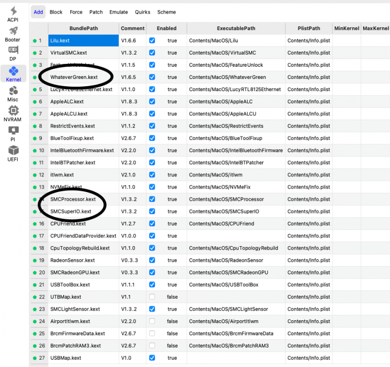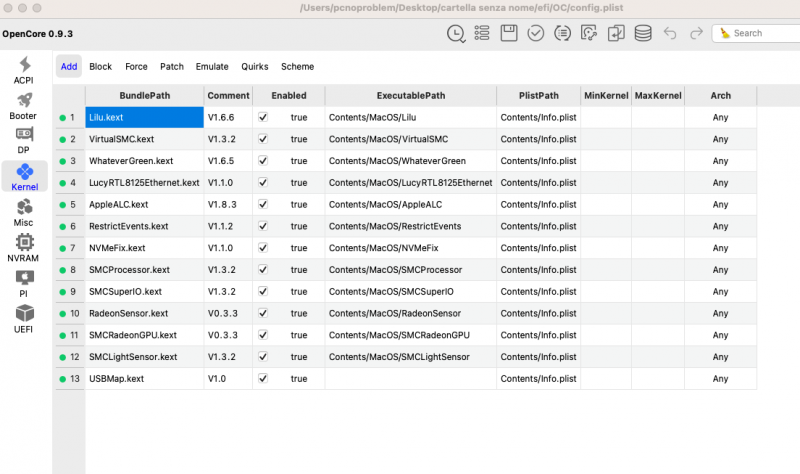 Ciao @Lorys89, se ho fatto qualcosa che ti ha fatto arrabbiare, ti chiedo scusa, ma non capisco del perchè di nessuna tua risposta. Ho modificato la mia EFI, ma non riesco a risolvere il problema dello stop. Si spegne per un attimo, ma poi si riaccende. Se potresti darmi qualche dritta, te ne sarei molto grato. Con il mio vecchio hack, avevo ricevuto un aiuto da @Gengik84e @antuneddu, se potete darmi pure voi qualche dritta, ve ne sarei grato. Ho lasciato soli questi kext allego il mip config. Qualunque consiglio per migliorare il tutto, è ben accetto. Grazie ancora config.plist.zip
