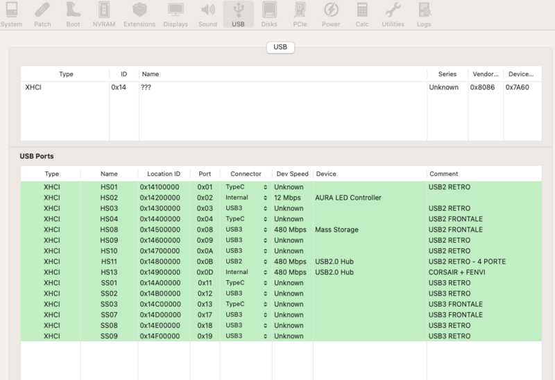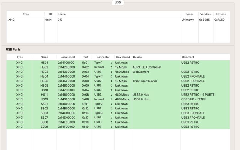 Ciao @mbarbierato, ho provato di tutto. Ho provato a togliere "aura Led", togliere la fenvi, scollegare qualunque cosa dalle usb, ma non va mai in stop. Due considerazioni, quando lo metto in stop, le ventole e il sistema si spegne per un attimo e poi riparte, dopo visivamente, vedo che le ventole, ciclicamente rallentano e poi riaccelerano in continuazione, come se ricevesse un input di spegnimento, ma poi riparte subito. Poi ho notato che appena accendo il pc e apro Hackintool e vado su usb, sono tutte verdi subito, anche se non c'è nulla di collegato, e non so se sia normale. Dalla tua risposta non ho capito se mi stai dicendo di togliere il controller dei Led (aura Led controller) o se ho tolto qualcosa e dovrei rimetterlo. Allego foto delle usb appena aperto il pc. quello che non riesco a capire cosa sia la usb nel riquadro in alto. Grazie per qualunque aiuto mi possiate dare. -