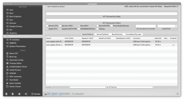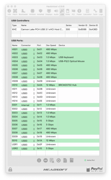 Chiarissimo grazie. è la somma delle HS e SS a non dover superare 15... fatto ma non va ! Ho messo Zero alle porte dovute ma in Ioreg me le vede ancora, ho fatto anche il drop della SSDT ma nulla Scope (\_SB.PCI0.XHC.RHUB.HS11) { Method (_UPC, 0, NotSerialized) // _UPC: USB Port Capabilities { If ((HBTC == Zero)) { If (((UMAP & 0x0400) == 0x0400)) { Return (GUPC (Zero)) } Else { Return (GUPC (Zero)) } } Else { Return (\_SB.UBTC.RUCC (HBCR, One)) } } Method (_PLD, 0, NotSerialized) // _PLD: Physical Location of Device P.S. il mio SSDT messo nella patched si chiama SSDT-5-A M I.aml
