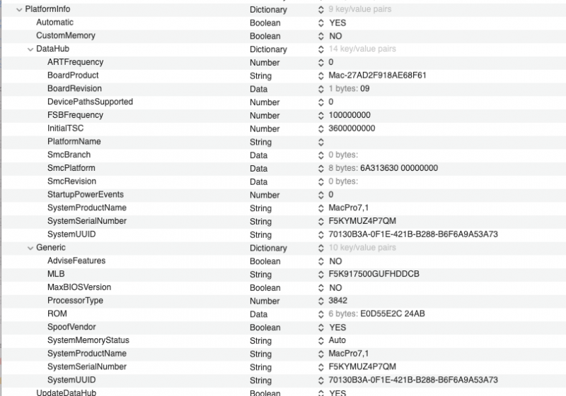 Booted by Clover 5144 with ProvideCurrentCpuInfo Quirk enabled my Ryzen 1700X hackintosh can use brief kernel patches now. Unfortunately three patches changed from 8-cores to 6-cores and booted by Clover 5144 with ProvideCurrentCpuInfo Quirk enabled my FX-6300 hackintosh can not use brief kernel patches at Big Sur & Catalina, etc. which seems only working at Monterey. I don't know the reason why. [Solved] 1. For those can not be booted by brief kernel patches in my FX-6300 hackintosh due to two reasons: (1) The System Version changed to 10.13.6 instead of 10.15.7 or 11.6.x (2) I need fix one patch's MatchOS to 11.x,12.x config-test.plist.zip config.plist.zip