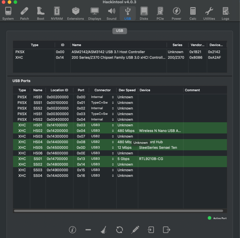 Metto uno screen che mi sembra strano...mentre cerca di collegarsi poi esce questa X rossa... Comunque bisogna aspettare OCPL le abbiamo provato tutte 😄 Questo è quello che mi da hackintool. Praticamente mi vede regolarmente l'USB del chipset principale ma non quelli extra diciamo 😄