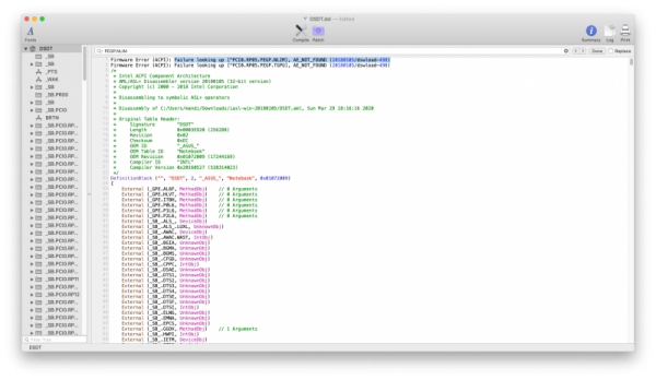 1. Ho provato ad estrarre il DSDT del portatile da Windows10 con SSDTtime poi decompilato con iasl e già lì nel prompt dei comandi vedo questi due errori che poi si ripresentano nelle prime 2 linee. Non so le sigle a cosa si riferiscano, ma dato che c'è un riferimento ad un errore nel firmware ho pensato che si tratti di opzioni nel BIOS settate male? Il problema è che nel mio BIOS non ho tutte le opzioni che QUESTA guida richiama. Quelle che c'erano le ho disattivate. Sapete che devices sono quelli indicati nell'errore? E come risolvere?