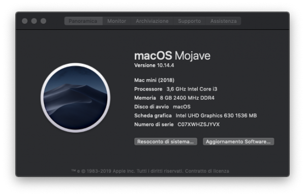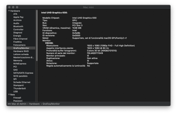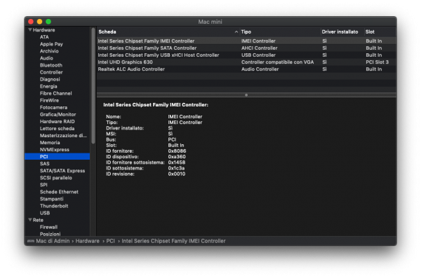 Ha funzionato sono in DVI :) Ha scritto dopo 22 minuti 56 secondi: Ripristinato le @gengk84 PCI sempre tutto OK: - Ultimo config usato: Ci fosse NVRam nativa sarebbe Perfetta, STOP sempre perfetto... Ha scritto dopo 9 minuti 35 secondi: In HDMI ieri OpenGL mi dava 40, ma sappiamo che cine è molto dipendente da come gestisce i moltiplicatori del risparmio... - PM - config_MacMini_8.1_3.plist.zip