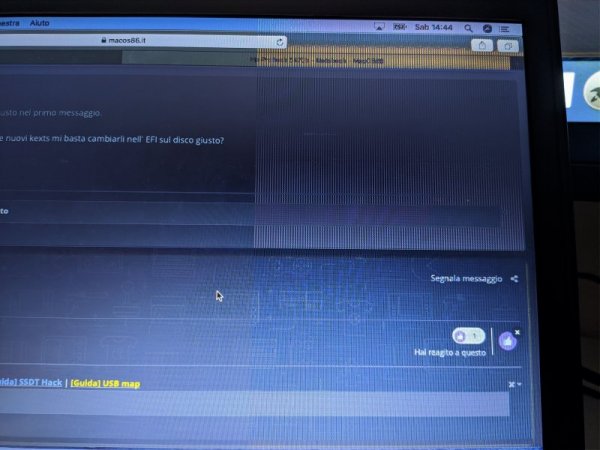 Ho cambiato il kext e adesso funziona anche il trackpad, ora ci sono tre cose che vorrei migliorare. 1. La batteria non viene riconosciuta e quindi l' indicatore non da alcuna informazione in merito 2. Quando spengo il pc, questo rimane acceso e devo completare lo spegnimento con il tasto. (Ho provato a cambiare nel config il fixShutDown mettendolo a true ma non ha funzionato) 3. Ho questo problema con il monitor (allego immagine), su windows risolvo cambiando il refresh da 60Hz a 40Hz, ho provato ma con macOS quando metto 40Hz la situazione addirittura peggiora. Cosa può essere? Ci sono soluzioni per questi tre problemi?