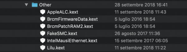 Grazie, ho aggiornato Clover, Lilu, Applealc e fakesmc, gli altri non li trovo ... ho cancellato i drivers che mi hai suggerito, ma ne rimangono molti di più di quelli che usi tu. Significa che devo eliminare anche tutti gli altri e lasciare soltanto quelli tuoi?