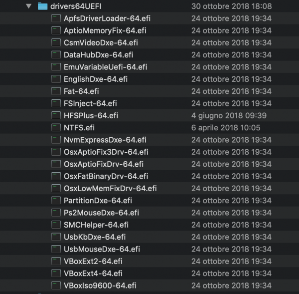 Ciao a tutti, mi sono accorto che dopo l'aggiornamento a Mojave è passato tutto in Apfs. il funzionamento dell'hack è ottimo se non per la dimensione enorme della gui di clover all'avvio, cosa che però non mi da fastidio che ho provato a risolvere con i vostri consigli ma invano. Il motivo per cui vi scrivo è che leggendo i post precedenti ho capito che ci sono troppe drivers installati e vorrei fare pulizia senza danni. in allegato ci sono le istantanee con la configurazione. aspetto consigli, grazie. P.S. di solito, da incompetente, aggiorno clover così com'è senza toccare nulla... lo so sono proprio scarso... :-)