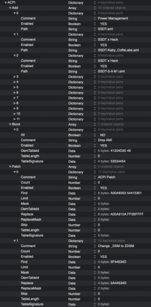 Dopo avere cambiato alcuni settaggi ora riesco ad avviare 😀 ssdt mappatura non funziona probabilmente neanche ssdt hack (non so come si controlla) e neanche ssdt PM funziona, quindi tutto il reparto ACPI! Visto che in clover funzionano, probabilmente dipende dal fatto che non so come inserire le drop tables di clover ed inoltre non so se in OC c'è la SortedOrder. Cosa serve per poter controllare visto che quello che ho allegato precedentemente è inutile visto che è stato cambiato?