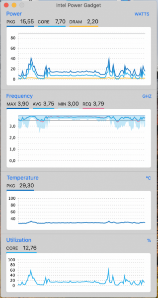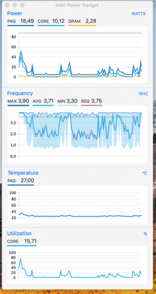 5. Bene. Problema USB risolto. Grazie. Ora sto facendo un test con Intel Power Gadget ed ho notato che il processore lavora sempre intorno a 3,5 GHz. Mi ricordo che quando istallai El Capitain abbiamo dovuto modificare qualcosa nel DSDT se non erro. Questo è uno screenshot di Intel Power Gadget.