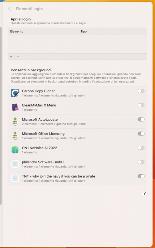 16. Buonasera sono sempre io che non diciamo altro....... come eliminare residui di programmi disinstallati ma ancora residenti ( in consenti in Background su Mac Os ) non riesco a trovare la soluzione grazie chi volesse darmi una dritta allego foto