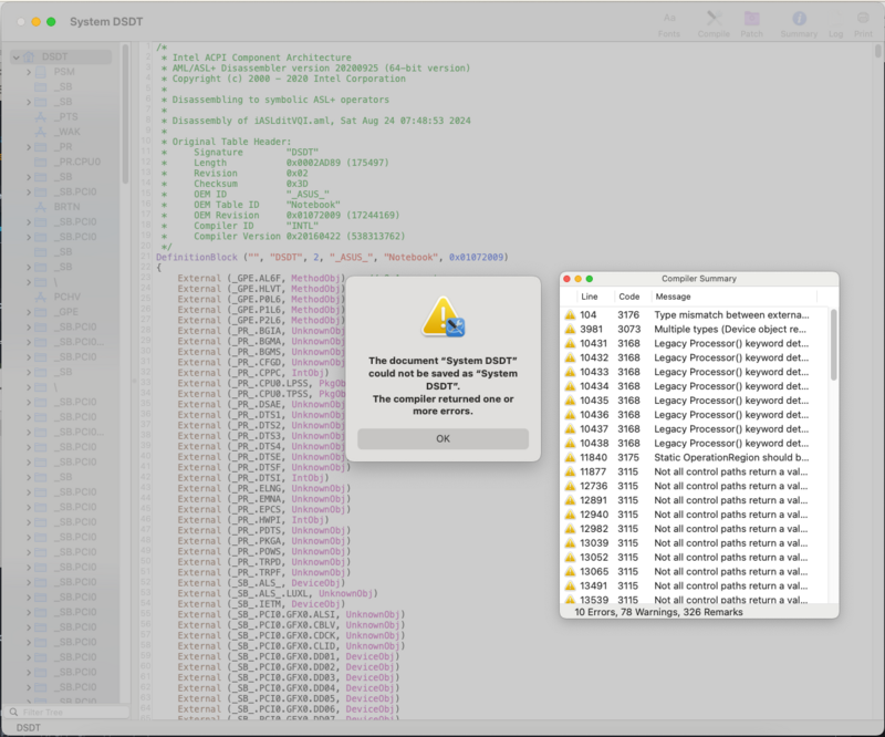 Ecco i file. Purtroppo il DSDT in formato .aml non riesco a generarlo, maciASL mi restituisce un errore di compilazione quando provo a salvarlo in quel formato ioreg+dsdt.zip