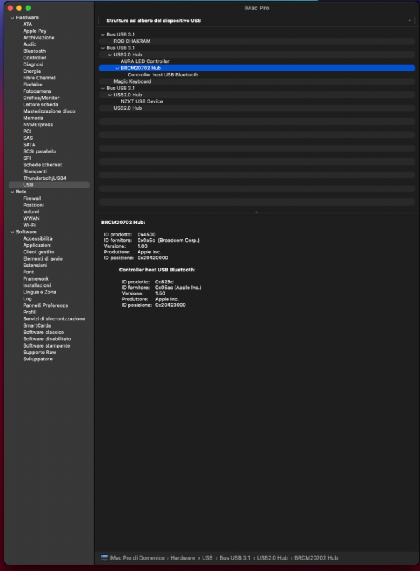 Salve a tutti, come da titolo scheda Bluetooth non riconosciuta in mac High Sierra, deduco che il problema risiede nella USB interna del mio pc. La scheda di riferimento e' questa: MQUPIN BCM94360CD scheda wireless AC175 https://www.amazon.it/gp/product/B089Q86SJD/ La cosa strana e' che su BigSur funziona tutto e ho utilizzato la stessa EFI che ho utilizzato per High Sierra. MB: asus rog crosshair viii hero wi-fi (X570) CPU: amd ryzen 9 3900x RAM: G.Skill - DDR4 32 GB Trident Z GPU: GTX980 Archivio.zip