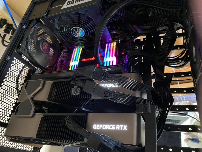 Ultimately I managed to finish the install by passing the target nvme to my Windows VM and running the initial install from the installer iso from there, then finishing on the bare metal itself. What a mess. @fabiosun Yes, I decided to keep the 2 3090 FE cards I got a few weeks back at MSRP. Was debating re-selling one or both, but decided to do some GPU compute learning. Set them up in SLI (not sure if that helps with any apps), but took me a while to install them as I didn't want any water cooling and struggled to find a case to run them in Slot 2 and 4 (settled on a BeQuiet 900 Pro in inverted layout and some minor mods - picture is upside down for some reason). I wanted to keep my x16 slot free for my 4x4x4x4 raid NVMEs. Was a challenging re-do of my build. Finally done with Windows baremetal - what benchmarks would you like to see?
