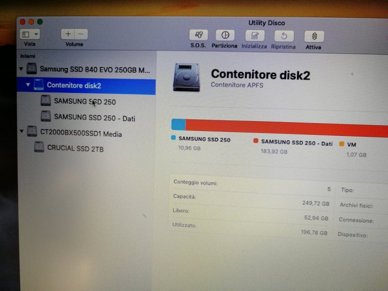 23. Riporto a galla questo thread per una richiesta che riguarda questa configurazione e il notebook in oggetto. Premesso che il notebook funziona perfettamente, ho tentato di fare l'aggiornamento di Catalina alla versione 10.15.7. Scarica regolarmente l'aggiornamento e chiede il riavvio come di consueto. Al riavvio si è creata come sempre la partizione "Installer data" ma nel momento in cui la seleziono e il sistema si avvia per installare l'aggiornamento, non accade nulla e dopo un pò ottengo una schermata che mi dice che MacOs non può essere installato perchè le risorse dell'installer non sosno state trovate. Dalla stessa schermata ho notatao che andando nelle utility disco non vedo nessuno dei due dischi installati nel sistema che ovviamente avviando il sistema regolarmente sono presenti. Ho provato, avviando regolarmente il notebook, a fare un SOS su quella partizione Data ma non cambia nulla. Come mai non vede i dischi di avvio facendo partire il sistema per installare l'aggiornamento appena scaricato? Ho provato anche a lanciarlo manualmente scaricando il pacchetto dal sito Apple ma quando chiede riavvio, punto e a capo. Cosa sto sbagliando? Su altri sistemi l'aggiornamento è riuscito perfettamente. La versione di Catalina attualmente presente è la 10.15.4