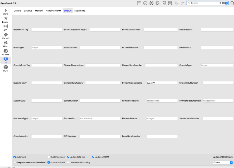 Eccolo in allegato guardando da OCauxiliarytool il SMBIOS m ami sembra che manchi qualcosa... config.plist.zip