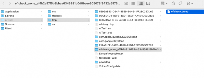 Praticamente è un check sul firmware che parte una volta a settimana e a me da finestra con errore con l'invito ad inviare ad Apple... ovviamente io chiudo la finestra e faccio finta di nulla ma volevo sapere se in qualche modo si può risolvere. Grazie "La nuova utility eficheck, che si trova in /usr/libexec/firmwarecheckers/eficheck, viene eseguita automaticamente una volta alla settimana. Controlla il firmware del Mac rispetto al database di Apple di ciò che è noto per essere corretto. Se passa, non vedrai nulla di ciò, ma se ci sono discrepanze, sarai invitato a inviare una segnalazione ad Apple." https://discussions.apple.com/thread/250310046