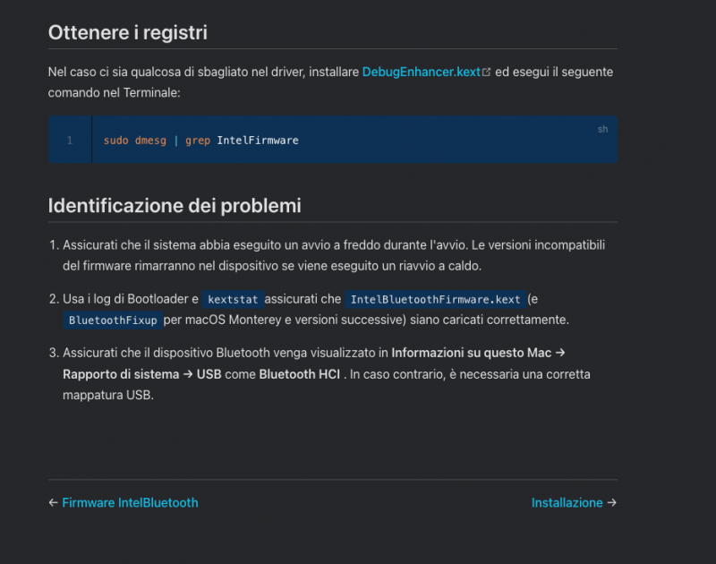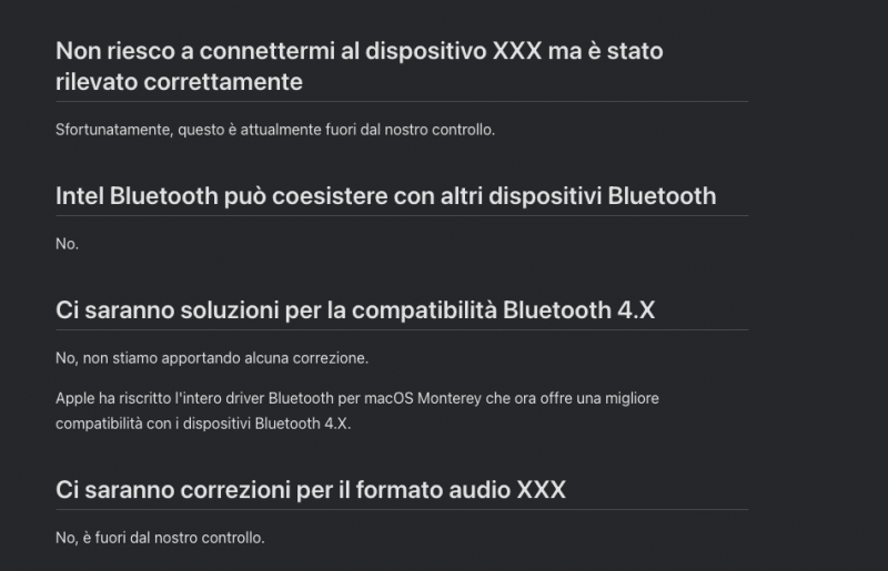 Probabile che rientri in quei casi di mancanza di supporto Mi spiego meglio: Monterey + BT = gatte da pelare, rileggendo la guida lo sviluppatore del progetto OpenIntelWireless inserisce la tua scheda tra le supportate ma non esclude la possibilità di casi di non funzionamento. Tratto dalla guida. -