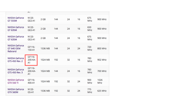 Forse non è una GTX550 ma una GTS450 ho tolto il dissipatore e sul chip Nvidia trovo questa sigla GF116-X00-KA-A1 dove ho inserito la X sul chip i furbetti hanno cancellato il numero che sicuramente deve essere un 2, se non sbaglio l'unico con architettura Fermi GF116 che corrisponde a questa sigla è GF116-200-KA-A1 che difatto è montato sulle GTS450. Allego alcune foto prese in rete riguardo i chip Fermi GF116, tra queste c'è anche quella che ho fatto al chip della scheda fake. -