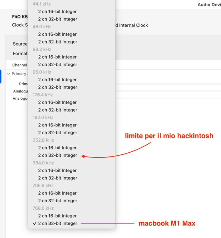 Ciao ho un problema sul mio hack (Monterey) di cui non so identificare la fonte e magari qualcuno di voi ha un suggerimento per come investigare sul problema: ho la mia musica su nas e uso jellyfin come server (docker sul nas), mentre come player installato uso jellyamp ho un dac esterno per le cuffie con ulteriore uscita rca collegato all'amplificatore e alle casse hack e nas sono su lan con cavi cat 5 i file sorgente sono sia Flac che MP3 nel pannello midi ho impostato un limite a 352KHz 32bit per il dac il problema é che dopo un po' inizia a gracchiare, direi dopo circa un ora, sembra strano ma é come se il mio hackintosh dopo un po' vada in crisi, ma potrebbe anche essere il jellyamp player, credo di poter escludere il server jellyfin perché posso fare il play dal server con su un altro impianto con un altro streamer di rete e non ha problemi. In questo momento ho collegato il dac ad un macbook con M1 Max in wifi e sto verificando se il problema sussiste anche sul macbook, visto che il problema si presenta dopo un po' e non sempre, richiede alcune ore di ascolto. Al momento attuale non ho sentito problemi sul macbook e tra l'altro posso impostare il dac ad un valore molto piu' alto, come da immagine, mentre sull'hackintosh devo fermarmi prima altrimenti gracchia subito. Credo che il problema sia da qualche parte legato all'audio dell'hackintosh con bitrate alti e non a altri aspetti della mia catena audio. grazie per qualsiasi suggerimento che possa indirizzarmi
