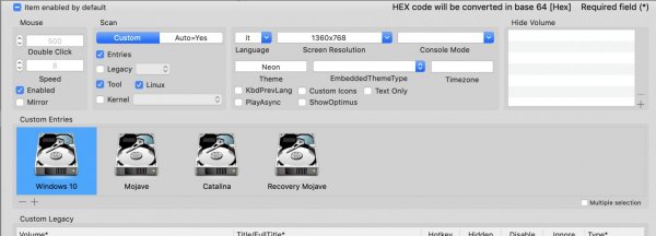 Triple/Dual/Quad Boot UEFI+Custom Entriesiconoclash replied to netgear's topic in [Guide] "Trick&Tips" Ciao, complimenti per le guide, sono veramente belle, una svolta. Stavo cercando di migliorare il mio HACK, ed ho provato ad installare Catalina su una partizione per provarla. I miei dischi sono: Samsung SSD 860 EVO 500 GB con Win 10 NTFS + Catalina APFS Samsung SSD 970 m2 con Mojave APFS Codificato WD dati. ogni HD ha una partizione UEFI, 2 sono vuote, mentre quella sulla M2 è quella configurata per il boot. Ho seguito la tua guida e nonostante abbia creato le Entries nella pagina di BOOT di Clover, compaiono comunque tutti i SO, solo che su quella Mojave, la principale, non mi esce il Nome scelto sotto il cursore, mentre nelle altre due si. (Spero sia stato chiaro) comunque metto foto. Ho settato qualcosa male o è dovuto all’apfs codificato? Dove li prendi i temi e come si installano ? Sicuramente ho fatto un casotto ma spero tu mia abbia capito lo stesso. Grazie del tempo che mi dedicherai.