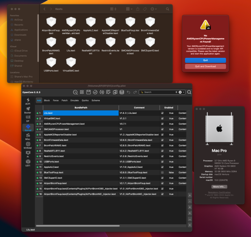 So for the longest time now i have had the error shown in the screen shot and i am finally sick of it. Please help me. I have the latest app and kexts and latest OC with RC Ventura and it is still happening. I believe the kext order is correct.