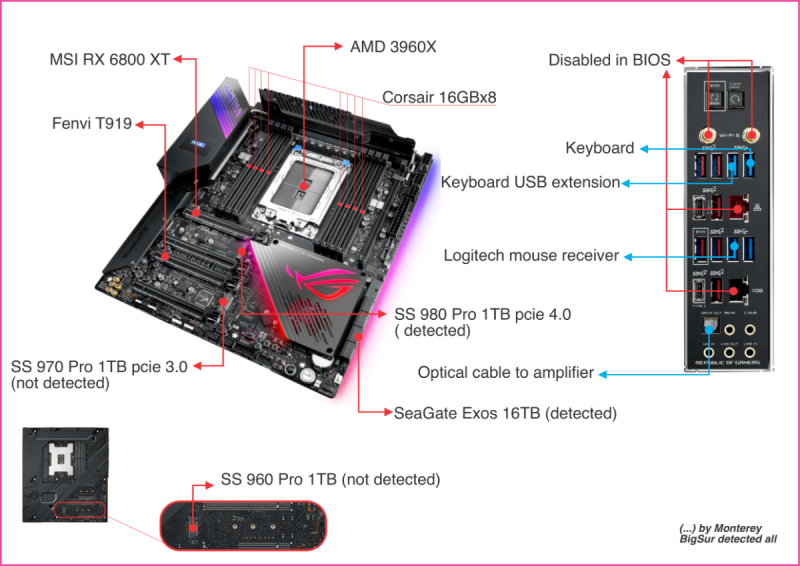 @fabiosun Sorry to bother you again, I've posted my problem, and got a reply from a guy who had exactly my HW, that's nothing works in Monterey same as me, other people also confirm that Monterey is no longer working. https://forum.amd-osx.com/index.php?threads/asus-rog-strix-trx40.2262/page-2#post-17665 I just want to know how could it possible that your system get to works so well. It's not a big deal, I'm happy with BigSur but just something still not clear in my mind.