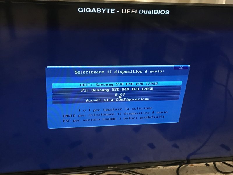 Ciao Gengik84, grazie per la veloce risposta. Come faccio a resettare la nvram se la procedura di istallazione non parte? In questo momento ho riattaccato l'SSD samsung e la chiavetta di installazione e quando accendo il computer e premo f12 per selezionare il dispositivo di avvio mi da queste possibilità (immagine n. 1). Se premo su 8.07 (la chiavetta mi riappare la scritta “Reboot and Select proper Boot device or insert Boot Media in select Boot device and press a key” (immagine n.2). Il clear cmos vorrei evitarlo (anche perché al netto della voce Mac OS X), il BIOS sembra funzionare). la Shell la posso usare quando creo la chiavetta? Grazie ancora per il tuo aiuto