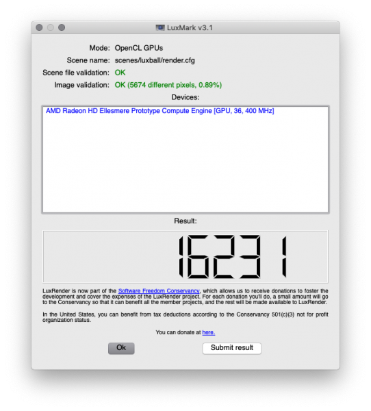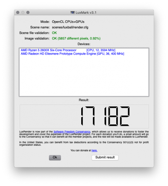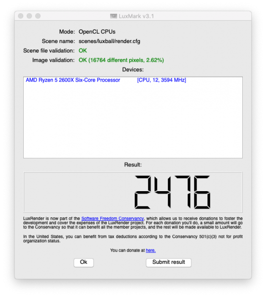 13. MacOS con Ryzen 2600X e RX590 Ha scritto dopo 8 minuti 28 secondi: Windows SOLO GPU perchè Ryzen è troppo recente per LuxMark :D Cmq perfettamente in linea con MacOS...