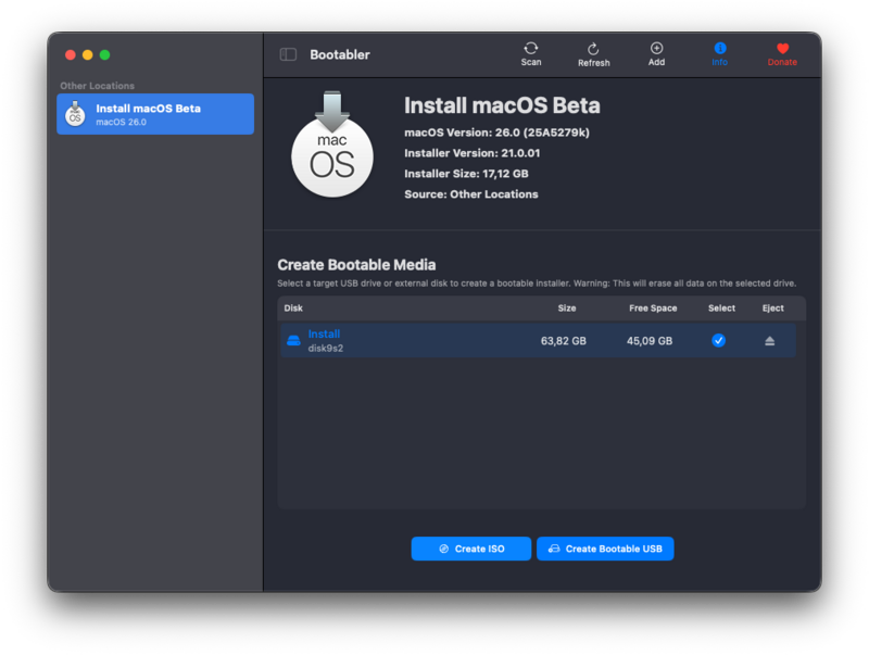 Volevo portare a cononscenza questa piccola app " Bootabler " per creare un usb d installazione e non solo Creata da Cyberdevs ( utente su IM ) scaricabile e ulteriori dettagli dal suo sito https://macmeup.com/bootabler/ Credo che non servono tante spiegazioni e' semplice e intuitiva con interfaccia gradevole Seleziona l " install macos " , la usb -> Create Bootable USB ( formatta la chiavetta da se , ma consiglio di preparla prima tramite Utility Disco ) Crea anche sempre dall " Install mcOS " una iso ( Create ISO ) da usare su VM , provata sia su OSX ( Fusion ) e su WIN ( VMvare )
