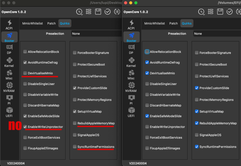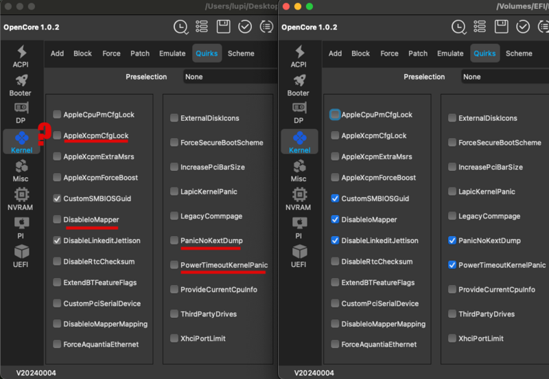 13. Haiooo 🙂 idee finite , qui sotto a sx c e' la tua config. e quella di destra e' la mia ( da BS a Sequoia , unica EFI ... nessun problema ) magari sono irrilevanti quei quirks ... pero' ? AppleXcpmCfgLock nel tuo e' disattivato l hai disattivato dal bios ? Il tutto e' molto strano comunque , hai provato a cambiare porta USB e usare una chiavetta diversa ?