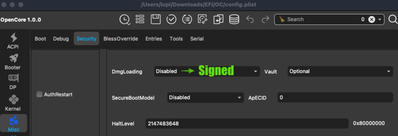 Ciao , qui dovresti avere Signed anziche Disabled SSDT E DSDT non credo si una buona soluzione anche perche' ci sono diversi errori da correggere in entrambi ... proverei ad usare solo SSDT-BASIC ( lo trovi in download ) Il smbios e' supportato non oltre Monterey come anche l integrata Quale os vuoi far girare / installare ? Rivedrei i quircks del Kernel ... non sono settati https://dortania.github.io/OpenCore-Install-Guide/config.plist/haswell.html#kernel