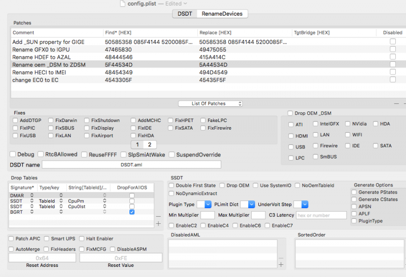 @iCanaro riavviata la VMWare ora legge la EFI LA GUIDA DICE : Sezione ACPI: disabilitiamo tutti i fix sia nel tab 1 sia nel 2 eliminiamo premendo - oppure disabilitiamo tutte le eventuali patch in dsdt patches ho eseguito come dice , ma nella mia drop tables vi sono delle spuntature , devo rimuoverle? (ti allego la foto) poi la guida dice : Sezione BOOT: Solo se stiamo installando Yosemite o precedente mettete il flag su Kext-Dev-Mode=1 mettendo high sierra ed essendo superiore non devo metterlo? la guida : Sezione Rt Variables: Solo se stiamo installando El Capitan o successivi aggiungiamo i valori: BooterConfig= 0x28, CsrActiveConfig= 0x67 a me BooterConfig= 0x28, CsrActiveConfig= 0x3E7 <----- devo metterlo uguale a quello della guida? grazie