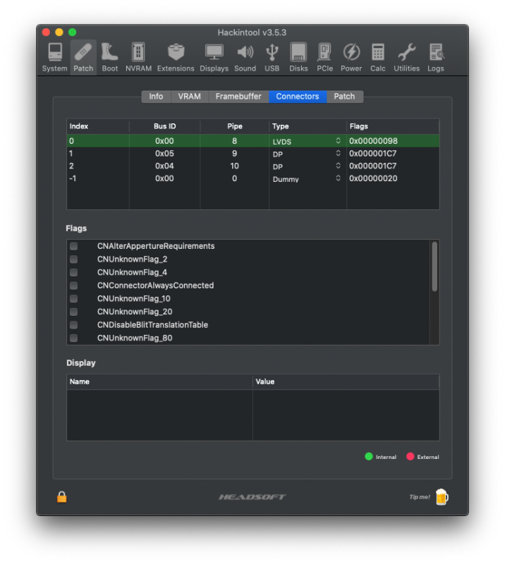 Per il momento l'unico problema che sto riscontrando è far funzionare l'HDMI e il bluetooth... Per l'cdmi, ho cercato qualche guida ma purtroppo non ha portato a risultati. Allego la schermata di hackintool (sia se è collegato o scollegato, nessun connettore viene evidenziato come external) Per il bluetooth ho cercato di caricare manualmente i kext IntelBluetoothFirmware e IntelBluetoothInjector, ma senza successo (se non erro la scheda wifi contiene anche la scheda bluetooth)