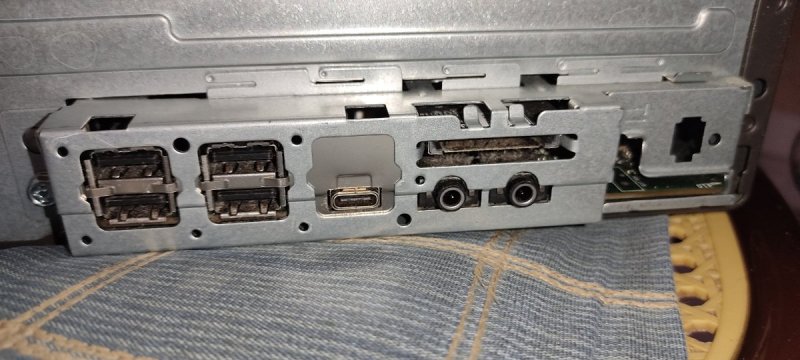 il problema con questa macchina e le dimensioni del case ridotte, come dicevo prima oggi l'ho aperto per sostituire il case ma come l'ho aperto mi sono reso conto subito che con un altro case (standard) avrò problemi con le uscite frontali della scheda madre, allego foto. come si può vedere la parte frontale della scheda madre dove ci sono le 4 porte usb3 - typec- uscita audio e microfono, finirebbero all'interno del case (standard) attualmente con le impostazioni attuali l'audio funzionante è quello frontale (verde) quello retro non funziona (rosso) con big sur oltre al problema evidenziato, c'é anche il problema dell'alimentatore gli attacchi sono proprietari no standard con alimentatore proprietario non si può collegare scheda video alimentata, se si poteva fare avrei già sostituito il case qui il problema è la scheda video se si trova soluzione per inserire scheda video potente su questo preferisco tenerlo ovviamente senza comprare di nuovo tutto