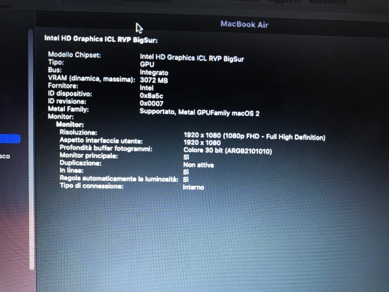 Sei un grande! Non so come ringraziarti/vi non mi sembra vero. Li ho provati tutti e tre. Funziona il primo. La vede come G1 a 2048MB e dovrebbe essere proprio lei. Appena appare il desktop sfarfalla un attimo (diventa schermo nero e poi torna sul desktop) e la luminosità è gestita un pò male ma dopo va benone. Anche la ethernet è ok. Sai per caso quali schede wifi potrebbero essere compatibili? Possiamo cambiare il titolo del post mettendo DELL VOSTRO 3591 Big Sur success così anche altri utenti che hanno questo pc possono venirne a capo? 😄 Solo altre due cose (pignolerie più che altro ma niente di che) Come posso levare il verbose mode e far comparire solo la mela? Opencore ha dei temi più carini all'avvio quando ti fa scegliere il sistema (ho fatto dual boot con win10 con successo). E inoltre cosa sono Openshell e nvram? si possono togliere? Inoltre per ora sembra che funzioni tutto tranne il trackpad ( il resto ho testato tutto: bluetooth, webcam, microfono, audio) Grazie ancora davvero siete stati gentilissimi e pazienti