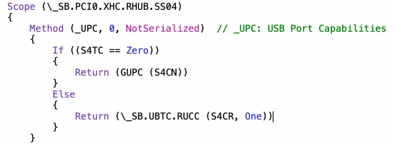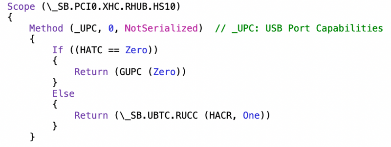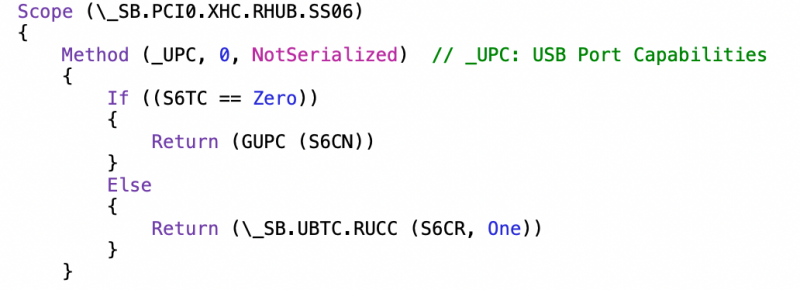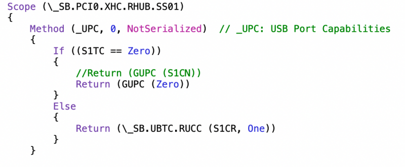 Ok ho capito la problematica... All'inizio del file c'è lo scope con tutti i nomi delle variabili come ad esempio: H=USB 2.0 A=Porta n°10 (A HEX) Name (HACN, One) Name (HAVS, One) Name (HATC, Zero) Name (HACR, Zero) essendo poi il codice: Method (_UPC, 0, NotSerialized) // _UPC: USB Port Capabilities { If ((HATC == Zero)) { Return (GUPC (HACN)) } Else { Return (\_SB.UBTC.RUCC (HACR, One)) } } Ci sarà sufficiente impostare: HATC e HACN a Zero nel caso la si voglia disabilitare oppure HATC a Zero e HACN a One nel caso la si voglia abilitare. Non so che cosa faccia il comando in ELSE. Comunque detto questo ora ho la mappatura perfetta!!!! però lo sleep non funziona ahahahaha Ora provo ad indagare con il grep sul syslog... Come si identifica il Lenght per il riferimento alla tabella originare da aggiungere al Delete??? EDIT Trovato nell'instestazione del FILE Comunque grazie mille per il supporto fino ad ora!!