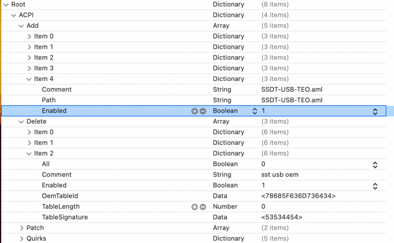 Dunque... La porta usb che verrà lasciata abilitata deve essere: Oppure è necessario togliere S4NC e sostituirlo con One? La porta che invece verrà disabilitata deve risultare così: A questo punto ho compilato, fatto salva con nome e aggiunto il file in EFI/OC/ACPI/SSDT-USB-TEO.aml. Ora aggiungo questo file nel config di OpenCore e poi che altre modifiche devo fare al file di configurazione? Il file SSDT-EC-USBX.aml va lasciato? e Kernel -> Quirks -> XhciPortLimit va lasciato abilitato?