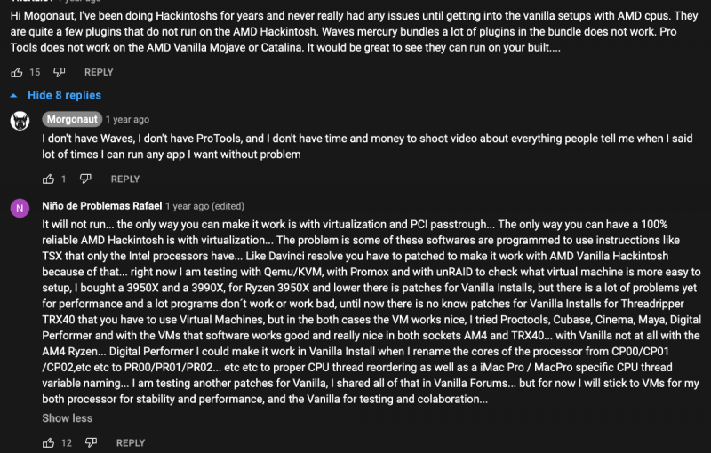 well you pointed exactly where I was begining to doubt. I know who you are speaking off and I was wondering if all this "hatred" she spoke off was not her hatred. So you advise me to build with the vanilla opencore ? Is this the bare metal you mentionned ? I would love to create an audio worstation with this CPU and 256 Go of Ram. You recommend me to use the dortania instructions ?