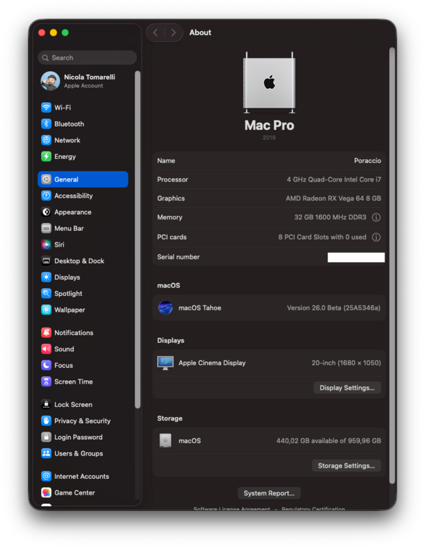 Dopo un po' di triboli con la patch di CaseySJ da aggiornare che mi ero dimenticato, FileVault e i relativi fileozzi per disattivarlo dopo relativo panico per password non più riconosciuta in fase decrypt... ecco la mia macchina ammiraglia aggiornata a Tahoe!