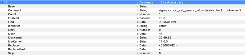 <?xml version="1.0" encoding="UTF-8"?> <!DOCTYPE plist PUBLIC "-//Apple//DTD PLIST 1.0//EN" "http://www.apple.com/DTDs/PropertyList-1.0.dtd"> <plist version="1.0"> <array> <dict> <key>Base</key> <string></string> <key>Comment</key> <string>algrey - cpuid_set_generic_info - disable check to allow leaf7</string> <key>Count</key> <integer>1</integer> <key>Enabled</key> <true/> <key>Find</key> <data> ADoPgg== </data> <key>Identifier</key> <string>kernel</string> <key>Limit</key> <integer>0</integer> <key>Mask</key> <data> </data> <key>MaxKernel</key> <string>22.99.99</string> <key>MinKernel</key> <string>17.0.0</string> <key>Replace</key> <data> AAAPgg== </data> <key>ReplaceMask</key> <data> </data> <key>Skip</key> <integer>0</integer> </dict> </array> </plist>