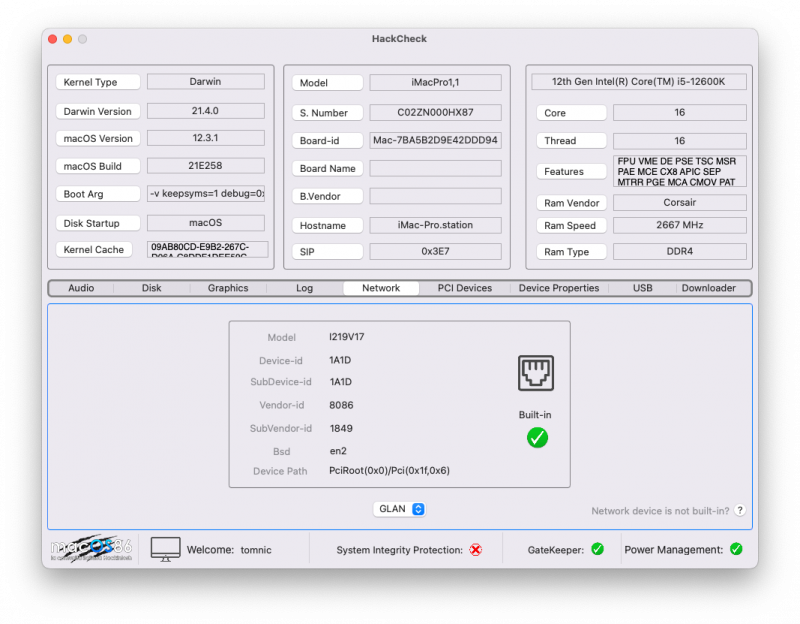 UPDATE: Aggiornata EFI a OC 0.9.1, rollback a iMacPro1,1... inserito SSDT universale Ciao a tutti, non pago del mio hack principale, fieramente AMD, con un po' di risparmi mensili e vendite di materiale mio più vecchio Intel + nVidia mi sono preso mesi fa questa mainboard Z690, curioso di testare sempre CPU e chipset non ufficialmente supportati da macOS, anche se della "controparte" Intel, restando su DDR4 perché le latenze della DDR5 sono a mio avviso ancora troppo alte rispetto al prezzo di vendita per produrre miglioramenti di performance sensibili: ...amo ASRock per prestazioni / prezzo / compatibilità e così non ho cambiato squadra... senza spendere un pozzo di soldi infatti l'ho accoppiata con questa CPU i5 12600k che per me è il miglior acquisto qualità prezzo se si vuole comprare un Alder Lake oggi: CPU composta da 10 core divisi in 6 + HT "classici" di potenza + 4 di efficienza energetica, roba da lasciare indietro gli i9 di decima e undicesima generazione in multicore, stracciandoli proprio in single core, campo in cui primeggia pure su qualsiasi CPU AMD. Alder Lake è così perfetto per carichi di lavoro che contano molto sull'IPC. Come dissipatore ho voluto provare per la prima volta il liquido e così un mio amico mi ha venduto a un prezzone questo kit AIO, veramente notevole per dimensioni del radiatore: Come RAM ho messo 32 Gb DDR4 2667 MHz d'avanzo dalla vecchia build i9 9900k venduta (a cui ho affibbiato i 16Gb più debolucci che vedete montati sopra in figura). Dopo un primo test "sul banco" con alimentatore del ciufolo da 400W micro ATX e iGPU integrata in Winzozz per vedere se tutto era funzionante a dovere a livello hardware prendo lo Chassis e inizio l'assemblaggio: Pure la GPU è di "recupero" per ora, una AMD Radeon RX 460 da 4 Gb con dissipatore custom perché la sua ventola era ferma (presa come scheda secondaria a pochi soldi illo tempore quando avevo la nVidia 3070 sulla mia build AMD e non volevo abbandonare macOS). Spero si abbassino le 6600XT perché vorrei acquistarne una se mai scenderà sui 400/450 eur nei prossimi mesi. Il Crucial da 1 Tb è di passaggio perché lo sto solo testando, lo rimpiazzerò appena possibile con un adeguato drive nvme degno del bus pciex 5 di questa grande piccola mobo. Il case Corsair Carbide 270R è veramente spazioso, i 360mm di radiatore ci sguazzano. Messo anche la Thunderbolt 3 Gigabyte Titan Ridge che mi tenevo da parte per futuri test con hardware adeguato che spero di fare presto e la Broadcom Wifi ac senza la quale non avrei potuto navigare visto che le ethernet intel integrate in Monterey sono ancora estremamente problematiche. L'alimentatore è un Coolermaster da 600W più che sufficiente ad ora. Ho cambiato opportunamente l'EFI che avevo per l'i9 9900k e la Z390 mantenendo l'installazione di Monterey 12.3 che avevo, fatto un po' di bench ed ho ottenuto questa meraviglia: ...CPU solamente a 60 gradi sotto massimo sforzo, sui 20 gradi in idle, risultato degno degli ultimi Mac Studio: Direi che il sistema di raffreddamento fa il suo sporco dovere egregiamente, e la CPU è sfruttata come si deve grazie al team di OpenCore. Eppure eppure... son convinto che se si applicassero così anche con le CPU AMD Zen, CPU non supportate tanto quanto le Intel Alder Lake ma da loro di fatto trascurate, avremmo un altro campione in macOS... ma evitiamo le polemiche e affianchiamo questo "muletto" Intel alla mia build ammiraglia. Come dico sempre, think REALLY different 😉 P.s.: ho lasciato la EFI con tutte le porte USB attive, appena possibile le mapperò nel dettaglio. Grazie per la pazienza!!! EFI 0.8.0 Alder i5 Asrock Z690.zip EFI 0.8.4 MacPro71.zip
