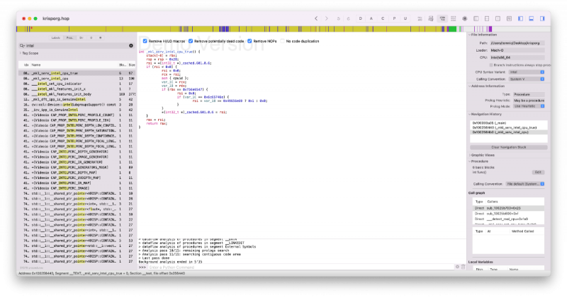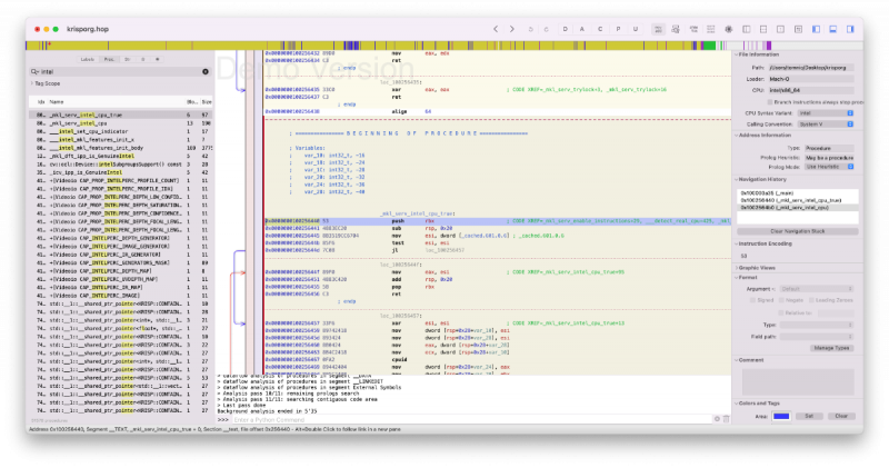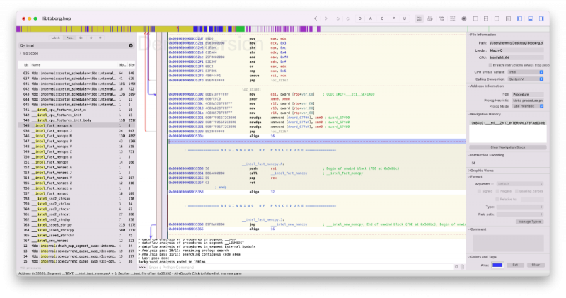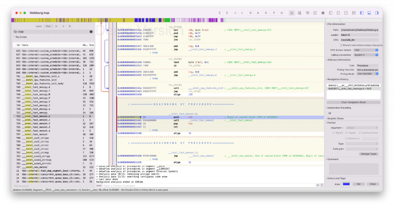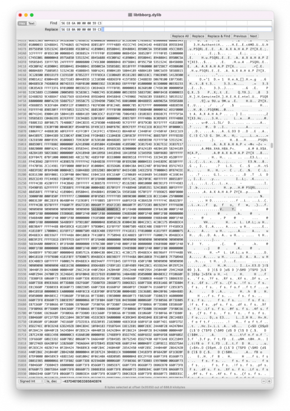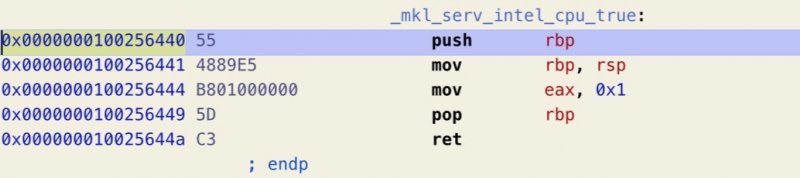 Note: There are at least two known variants of this method, https://github.com/Carnations-Botanica/IntelMKLFixup and https://github.com/JonathanFerraz/FriendlyAMD please remember to quote and/or write in this thread for discussing and talking with us about forking and developing this methodology. Work must be respected! Some History, facts and strategy Certain Mac apps use the infamous Intel MKL libraries, now called Intel OneAPI: those libraries are x86_64 compliant but in the macOS porting certain functions are intended to work only on genuine intel cpus: these are __intel_fast_memset.A and __intel_fast_memcpy.A. We can fool these libraries redirecting their calls to __intel_fast_memset.J and __intel_fast_memcpy.J which both work perfectly on AMD Hackintoshes, and as fast as possible given the fact that we lack AVX512. But we also need to fool them changing the function __mkl_serv_intel_cpu_true returning TRUE even when running on AMD cpus!!! This fix is based on Daniel de Kok's hint on his brilliant article https://danieldk.eu/Posts/2020-08-31-MKL-Zen.html given that the old trick of setting the environmental variable MKL_DEBUG_CPU_TYPE to 5 has been deprecated by Intel for obvious reasons on rather recent MKL libs implementations. Using only these three "patches" we can virtually make every Intel only app run on our AMD Hacks natively without using hypervisors and without bypassing or deleting important functions / files of our specific app. I'm trying to write a tutorial to make everybody who has a very minimal knowledge of x86_64 assembly and machine language code able to patch any offending binary for AMD cpus. The goal is trying to keep bare metal execution of macOS instead of circumventing any issue using macOS virtualization, which I think is more complex and can be used profitevoly only in high end configurations (16 cores or more, 64 gigs of ram or more). With modern kernel patches the execution of the mach vanilla kernel is virtually perfect, not losing any kind of GPU performance: https://github.com/AMD-OSX/AMD_Vanilla. The procedure in detail To start searching for the correct hex patterns we can use two really useful programs: one is Hexfiend (I use version 2.14.1), an Hex Editor for macOS, which is totally free, and the other one is Hopper (I use version 5.3.1-demo), a disassembler, which is not free but is sufficient for us to "look into" suspect binaries in the search of those three procedures in the demo version, which is free for 30 minutes. So fire up Hopper and click Try the demo: Drag and drop a "suspect" binary, like libtbb.dylib, found in numerous app like Autodesk Autocad 2022 and Maya 2022: Leave all the default options on, be sure to keep Mach-O 64bits as Loader selected (here you could select other type of architectures if found in the binary). Configure the preferences according to this screen: Now wait for some time to let Hopper disassemble all the binary (some minutes for the biggest ones), write to the top left side of the main windows the word "Intel", select Proc. next to the box you've just written and you should get this screen: Focus your attention to the list of the procedures in the left part of the window: you can clearly see __intel_fast_memcpy.A and __intel_fast_memset.A in this binary. Let's click on the first procedure: The first number of this part of the window is 0x000000000035350: it is the Offset (your position in the binary), the second, 56, is the Machine Language translation of its mnemonic Assembly command push rsi: it uses only one byte of memory... after the ; you can read a human readable comment. The second line, 0x000000000035351, one exact byte later, has 5 bytes of code: E8 6A 00 00 00, and it means call (E8) the procedure which starts 00 00 00 6A bytes ahead (byte's order of data is reversed in x86 machine language and the Assembly call function needs four signed bytes after it, positive for a jump ahead, negative for a jump backwards) which is __intel_fast_memcpy, confirmed by the comment. We need to change this line of code to call __intel_fast_memcpy.J, which starts 0A (ten in decimal) bytes ahead so that it will become: 0x000000000035351 E80A000000 call __intel_fast_memcpy.J ; ... You can easily verify that at the end the __intel_fast_memcpy.J calls the AMD compatible procedure ___intel_new_memcpy. Using a familiar approach with Clover / OC Kernel patches (excluding bit masks) we can say: Find: 56 E8 6A 00 00 00 59 C3 Replace: 56 E8 0A 00 00 00 59 C3 We can easily do this using Hexfiend, open it and drag your binary into its main window, go to the program's menu and select Edit -> Find -> Find..., choose hex, put Find values in the top write field, Replace values in the second one, hit Next and the found pattern should be highlighted, finally hit Replace: Note: only one instance of the Find pattern must be found and replaced. Save the patched binary (on the desktop for example for now), let's double check our work opening it with Hopper and clicking on the __intel_fast_memcpy.A procedure: Yes, the line 0x000000000035351 appears exactly as we wanted! Good work... If something looks different, try again following the instructions from the beginning of this tutorial or ask for further explanations in this thread: Next, we can go on patching the __intel_fast_memset.A procedure. Same kind of work, click on this procedure in Hopper and inpect the code: ...let's focus our attention to its code: ...similarly to the latest patching procedure we need to change the second line (offset 0x000000000035481) to: 0x000000000035481 E80A000000 call __intel_fast_memset.J ; ... ...in Find / Replace terms: Find: 56 E8 4A 00 00 00 59 C3 Replace: 56 E8 0A 00 00 00 59 C3 Use Hexfiend exactly as before remembering only to replace one instance of the found hex pattern, save the binary to the desktop, open it with Hopper, select the __intel_fast_memset.A procedure and double check the resulting patched code with Hopper: Great! Even this time the AM