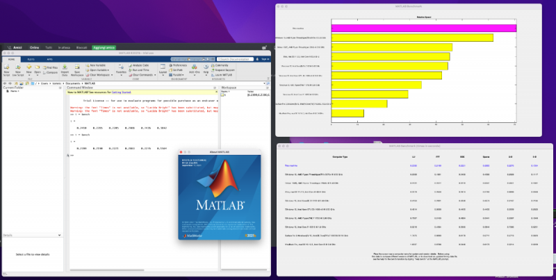 The fix is divided in two parts, as a prerequisite disable SIP for now: 1. Fix the installer A. Download pacifist https://www.charlessoft.com/cgi-bin/pacifist_download.cgi?vers=3.6.2&type=zip install it and after mounting the matlab_R2021b_maci64.dmg go inside the icon InstallForMacOSX.app -> Show package contents -> Contents -> MacOS, open InstallForMacOSX with Pacifist; B. Drag the InstallForMacOSX root folder to your desktop and rename it to InstallForMacOSX; C. Overwrite the two files libtbb.dylib and libtbbmalloc.dylib inside Desktop -> InstallForMacOSX -> bin -> maci64 with my two patched revisions attached here; D. Launch InstallForMacOSX.app inside your extracted desktop InstallForMacOSX folder and install whatever component you want. 2. Fix the actual installed app A. Go inside your Applications folder -> MATLAB_R2021b.app -> sys -> os -> maci64 and replace the libiomp5.dylib with my patched revision attached here; B. Again go inside the Application folder -> MATLAB_R2021b.app -> bin -> maci64 and replace libtbb.dylib, libtbbmalloc.dylib, mkl.dylib, blas.spec and lapack.spec too; Launch MATLAB_R2021b.app and issue the command t=bench to execute a functional test and a benchmark for the most common functions. Feel free to post your screenshots here for comparison, this is mine: Notes: 1. The patched libs are the original libs supplied with this particular version of Matlab but patched to only redirect properly the Intel Fastmem / Fastmemcpy routines on AMD Hackintoshes and to mimic a "true" Intel CPU; 2. The new fixes make this function perfectly working, even when A is a 3x3 matrix: [Q, T] = schur(A); libtbb.dylib.zipblas.spec.zipmkl.dylib.ziplibiomp5.dylib.ziplibtbbmalloc.dylib.zip lapack.spec.zip