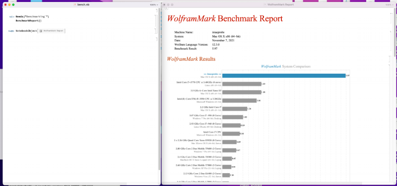 Disable SIP as a prerequisite as always. For this program the installation is straightforward: just mount the downloaded dmg, drag the app into your Applications folder in macOS drive. Then you only need to overwrite libiomp5.dylib, libmkl_avx512.dylib and libmkl_core.dylib with my patched versions into Mathematica.app/Contents/SystemFiles/Libraries/MacOSX-x86-64 I include a little benchmark to test the functionality of the app, bench.nb, just unzip it and open it in Mathematica then run it placing your cursor before the word "Needs" in the worksheet and choose the menu function Evaluation -> Evaluate cells. Feel free to post some results, here are mine 😉 Note: as always, native libs of this specific app version are patched to redirect the problematic functions intel fastmemset and intel fastmemcpy to the fastest compatible similar functions for our AMD hackintoshes, also fooling the Genuine Intel CPU check with a trivial function which gives always true as the returning value: no more need to inject code, no more need to use environmental variables or old prepatched libs. libiomp5.dylib.zip libmkl_avx512.dylib.zip libmkl_core.dylib.zip bench.nb.zip