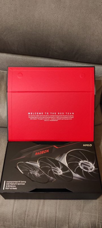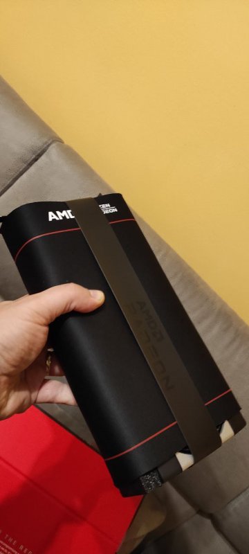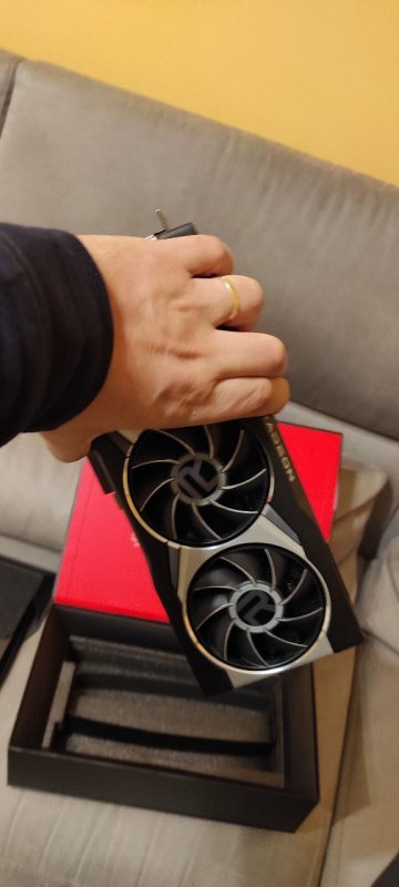 Ragazzi che emozione... l'ho ordinata dove lavoro a Roma tramite eBay da un tedesco che non l'ha venduta a un prezzo esageratamente più alto dell'MSRP e l'ho portata così stretta stretta durante tutto il viaggio in treno: Arrivato a casa la poso sul divano: Completamente sigillata, veramente bella come si presenta la scatola, apro: Benvenuto nel team rosso... sììììì!!! Dopo tanto tempooooo!!! Avvolta come si deve in una specie di panno in pelle, wow! Pesa molto... tri slot imponente... magnifica da "spogliare"! Tastino meccanico gentilmente offerto da Lisa Su... se è porno tolgo 😄 Eccola nello chassis... di notte... bella e potente!!! Nella sezione inglese trovate i bench... in affinamento ^^ Vi anticipo che già sono particolarmente soddisfatto, in DaVinci supero due VII!