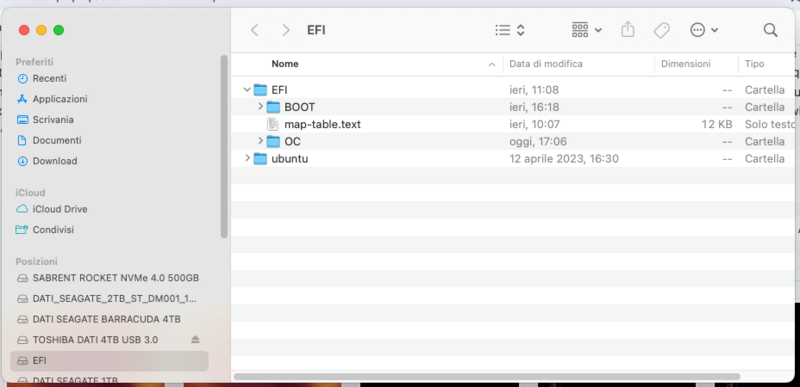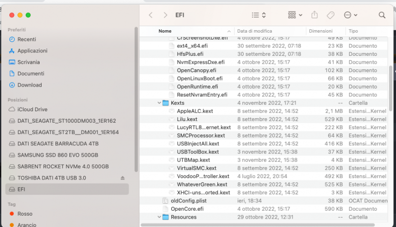 Ho apportato le modifiche tutto OK. Allego immagini. Tutti quei file txt che si generano e la cartella sys report??? Per lo spegnimento hai letto come faccio. Per voi sarebbe stato utile capire il perchè ma per me va bene anche così. Ho notato da subito,come da linux, che mac legge/vede i dischi collegati alla mobo e posso spostarli nel mac e non viceversa e vedo dai permessi che posso solo leggere. Non sono riuscito a modificare il permesso. Per il bluetooth ho trovato questo: https://dortania.github.io/OpenCore-Install-Guide/extras/monterey.html#bluetooth https://dortania.github.io/OpenCore-Install-Guide/ktext.html#usb